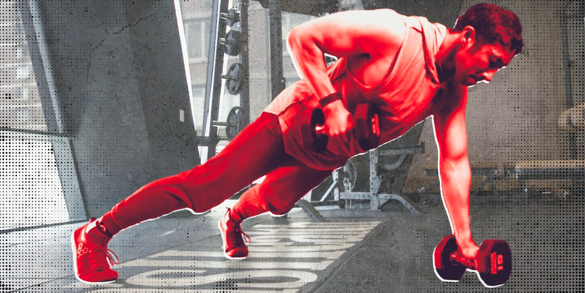 - Start with a pair of dumbbells on the floor. Get into a high plank position with your feet about shoulder-width apart, holding the handles of the weights in each hand. Squeeze your shoulder blades, abs, and glutes to create full-body tension.