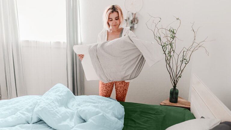 Because pillowcases are in constant contact with the oils of your skin and hair, toss them in the weekly wash with your sheets. If you notice they’re becoming dirty or stained before the week is finished, you may want to wash them even more frequently, or better yet, have an extra set of pillowcases on hand so you don’t have to wash them midweek.