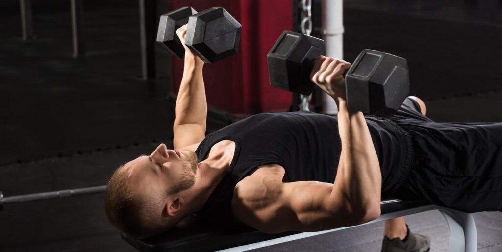 • Lower both dumbbells to your chest and press them back up.