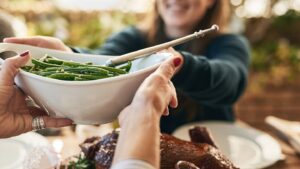 Avoid trigger foods. It’s understandable that, on a special occasion, you might give yourself permission to eat certain foods even though you know they will react poorly with your GI system. (Example: The cheese and cream in the scalloped potatoes.) “For those with digestive conditions or food intolerances, eating foods that you are sensitive to can cause bloating. For some people, it’s worth it for a special meal. But if you want to avoid being uncomfortable, make sure you check with the host so you can choose the dishes that work best for you,” says Wilson.